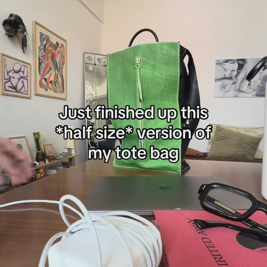 The bag in green is made from green cow nappa leather combined with black chrome-tanned leather. The black and red versions are made from suede-type leather combined with black chrome-tanned leather. The half-sized tote bag keeps the same height as the full-sized version but with a slimmer profile. It features a large vertical outer zipper pocket for fast, easy access to essentials like a tablet, books, or chargers, no digging required and a convenient side pocket on one side, perfect for your phone or sunglasses.