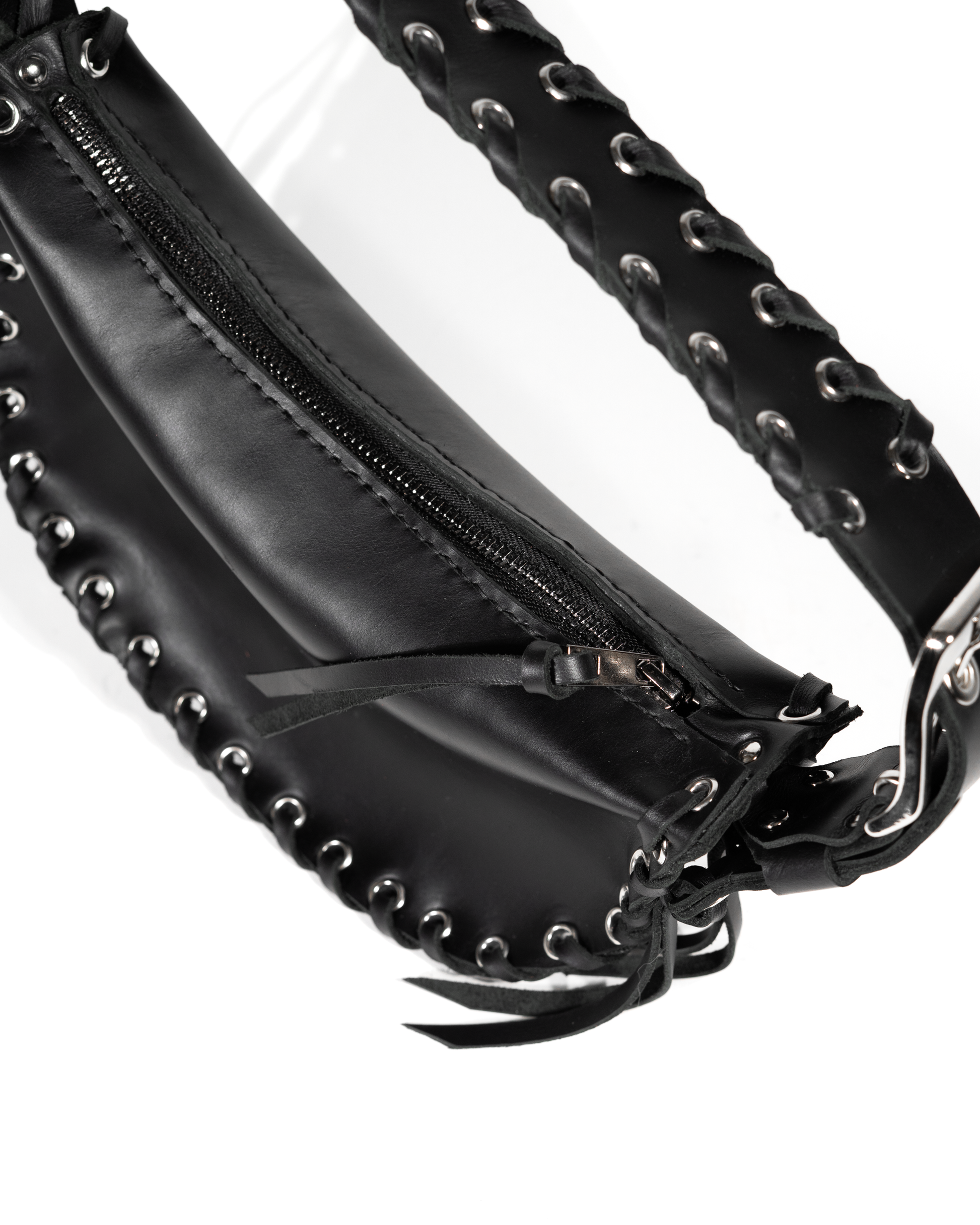 Cierre de cremallera con tirador de piel anudado, cosido a mano.