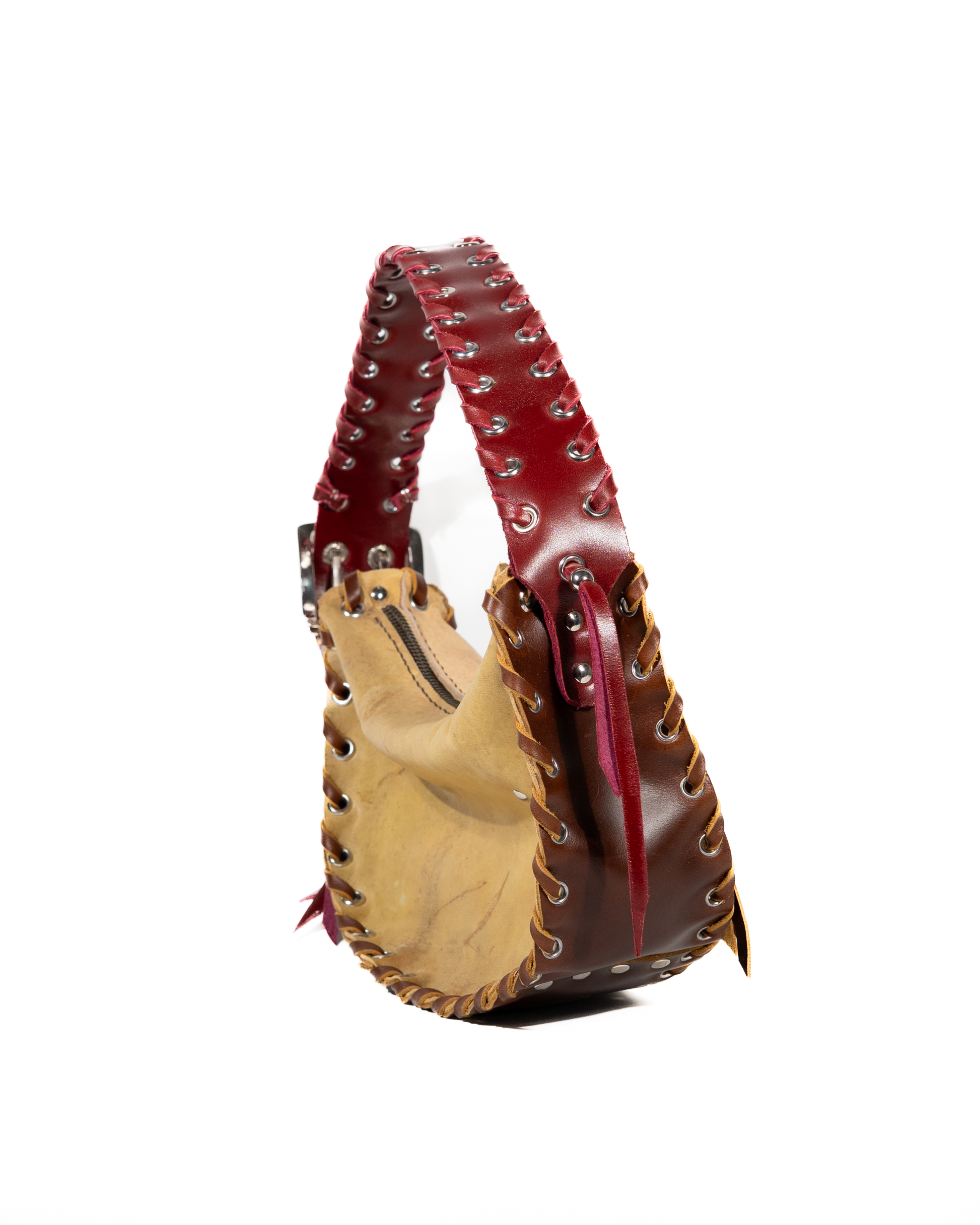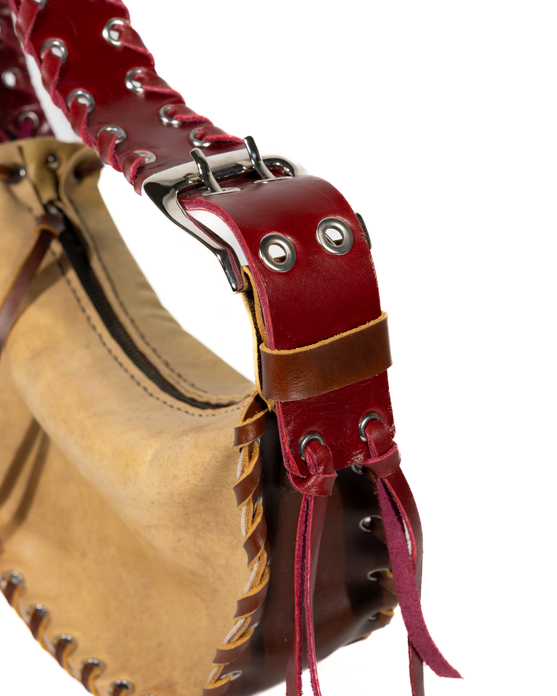 Esta bolsa única está confeccionada en cuero beige con acentos marrón y una correa en rojo cereza. La paleta de color se inspira en una pieza de pasarela de Issey Miyake de los años 90. Realizada en piel deadstock; es decir, solo había una piel disponible. Se trata de una pieza one of one. Una vez vendida, no volverá a producirse.