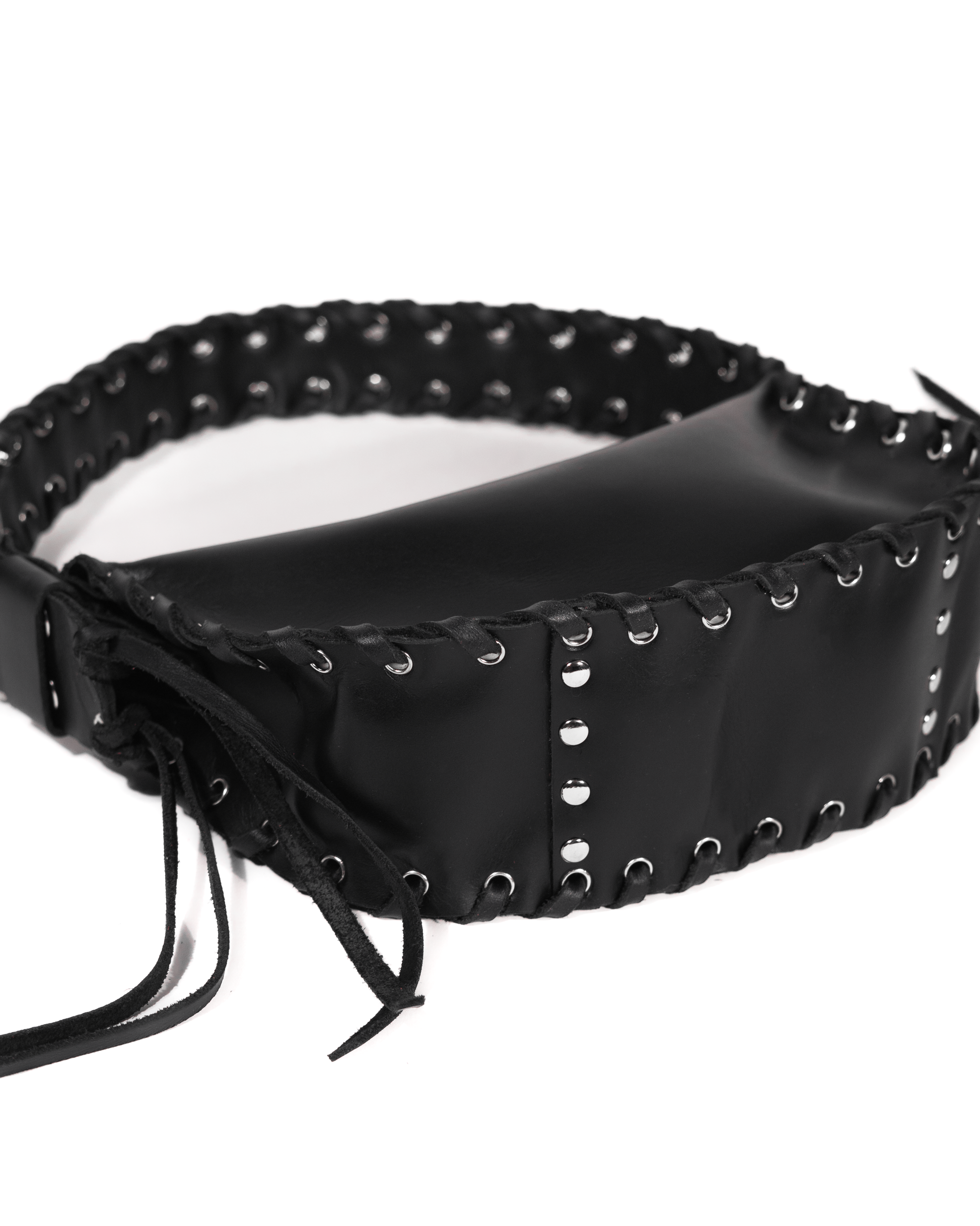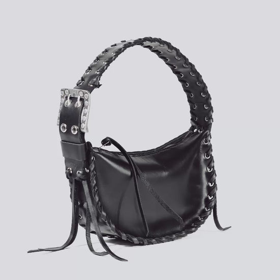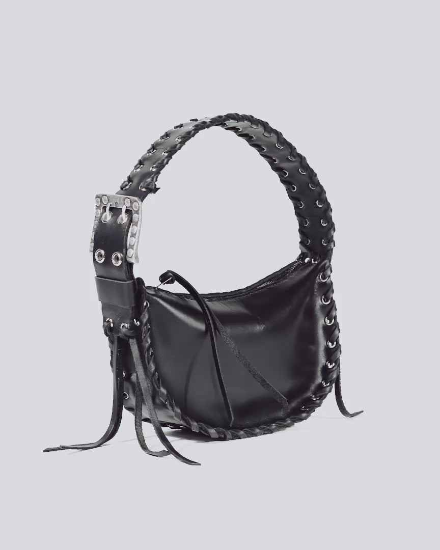 • Cierre de cremallera con tirador de piel anudado, cosido a mano.