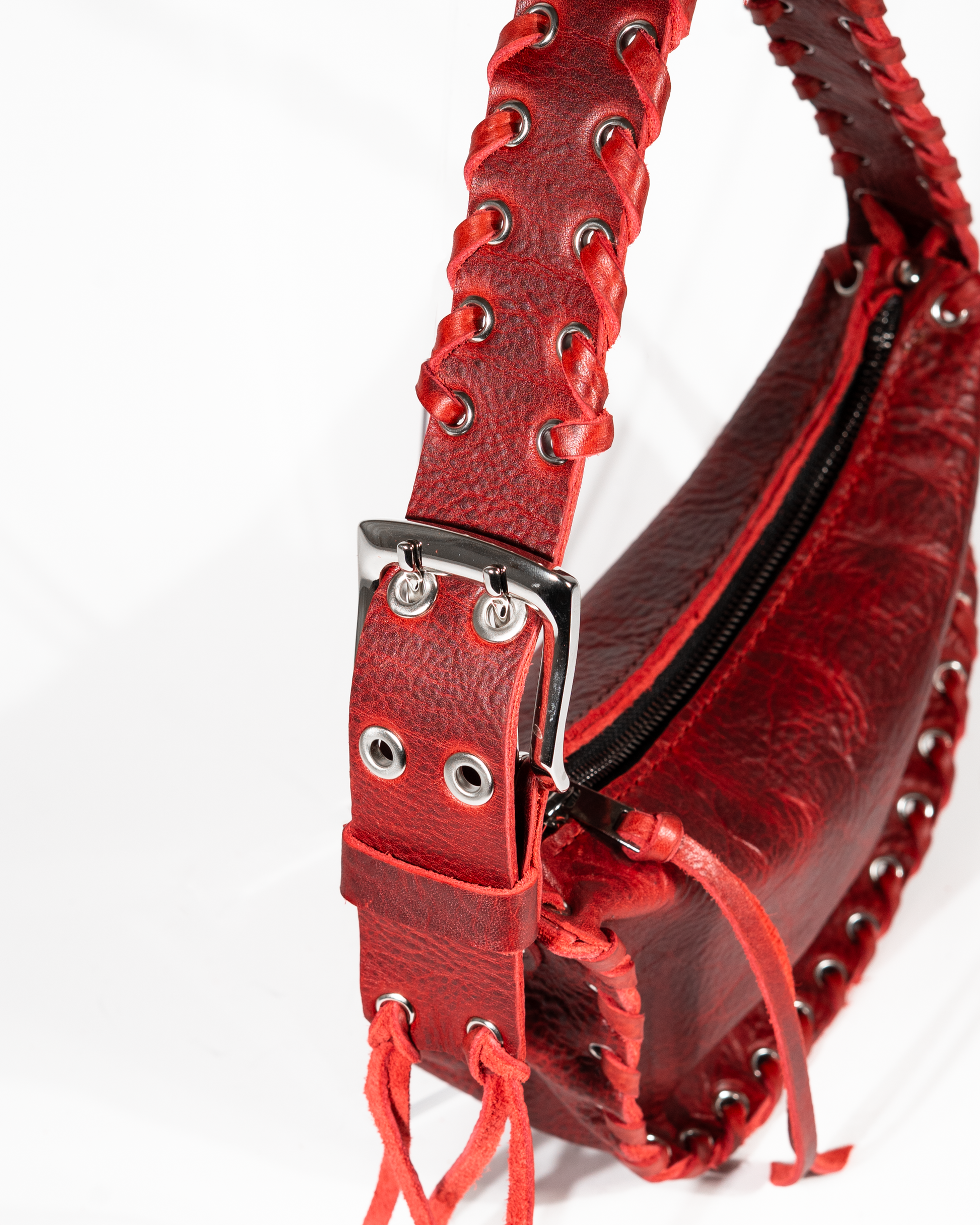 • Cierre de cremallera con tirador de piel anudado, cosido a mano.